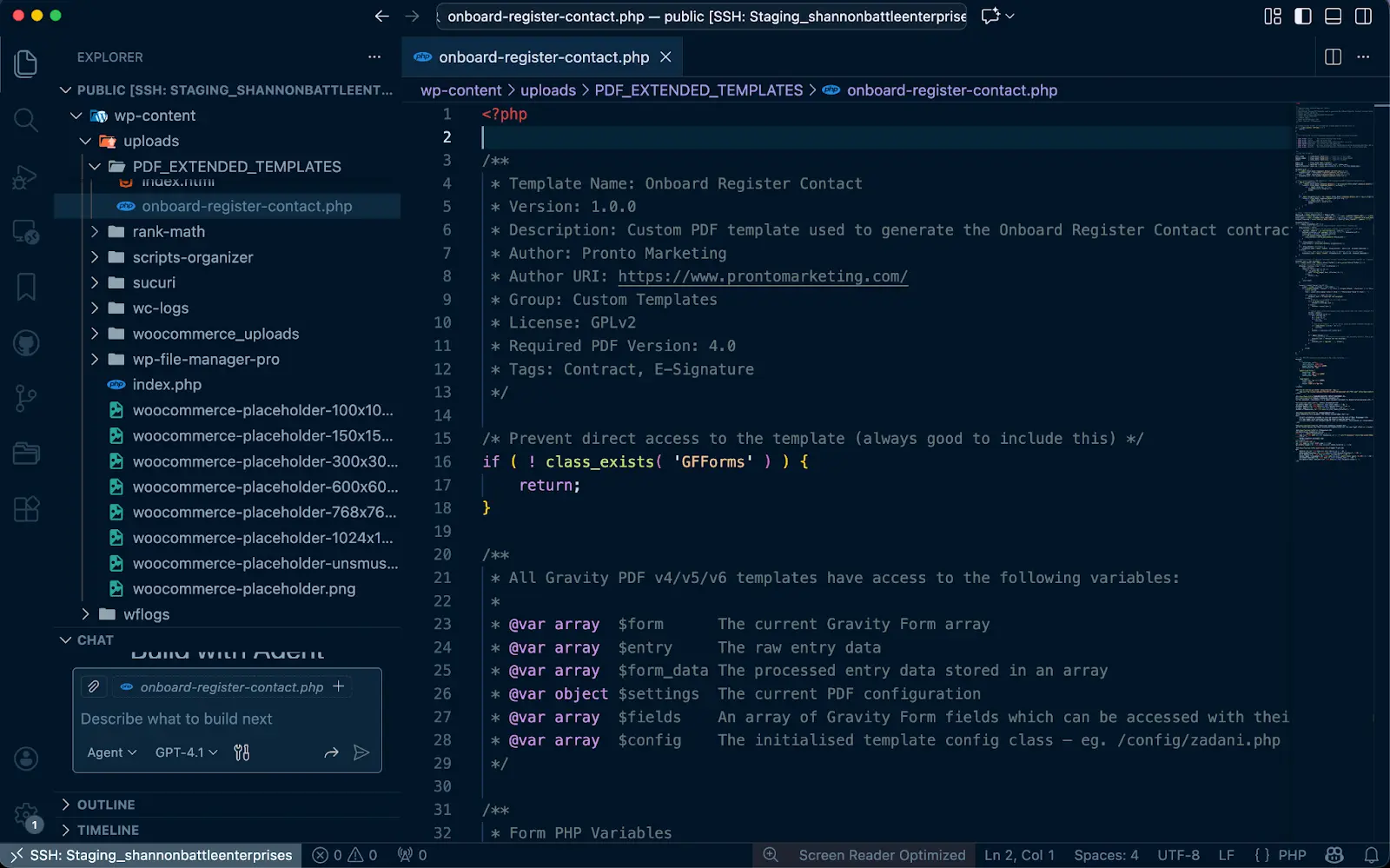 This custom file, onboard-register-contact.php, utilized a specific file header to register itself automatically with the Gravity PDF engine, ensuring it was recognized as a “Contract” and “E-Signature” compatible template.