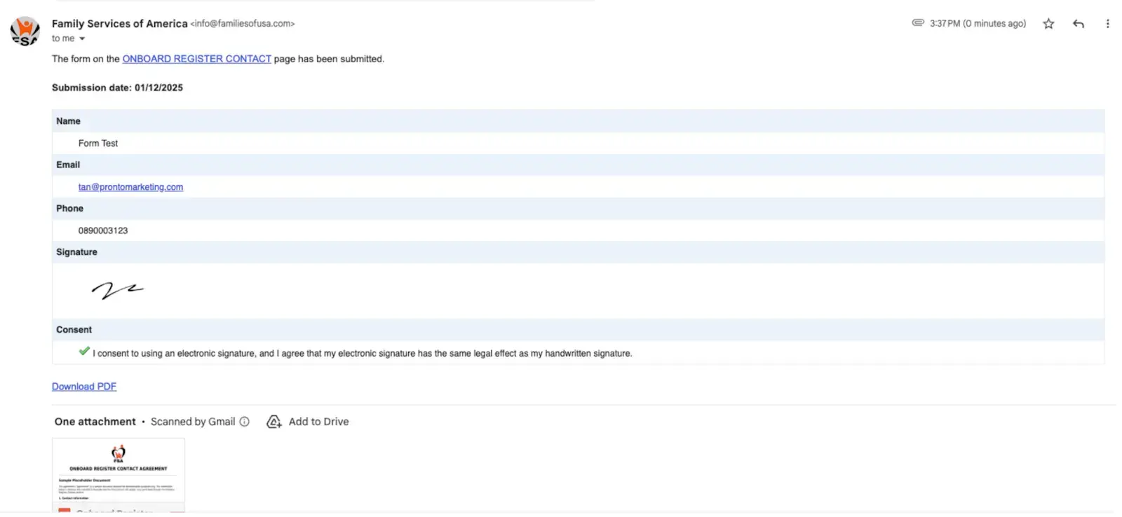 Pronto’s Website Support team engineered a solution using Gravity Forms combined with a Custom Gravity PDF template. This approach allowed for data collection, legally binding e-signatures, and instant document generation in a single step.