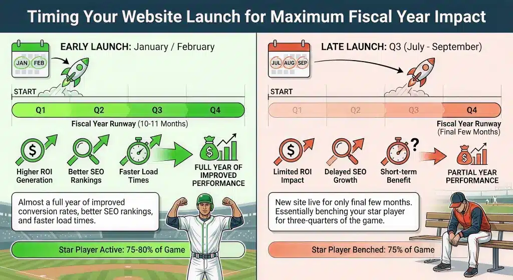 If you launch a new, higher-converting website in January or February, you give that asset a 10 to 11-month runway to generate ROI within the current fiscal year. You get almost a full year of improved conversion rates, better SEO rankings, and faster load times.
