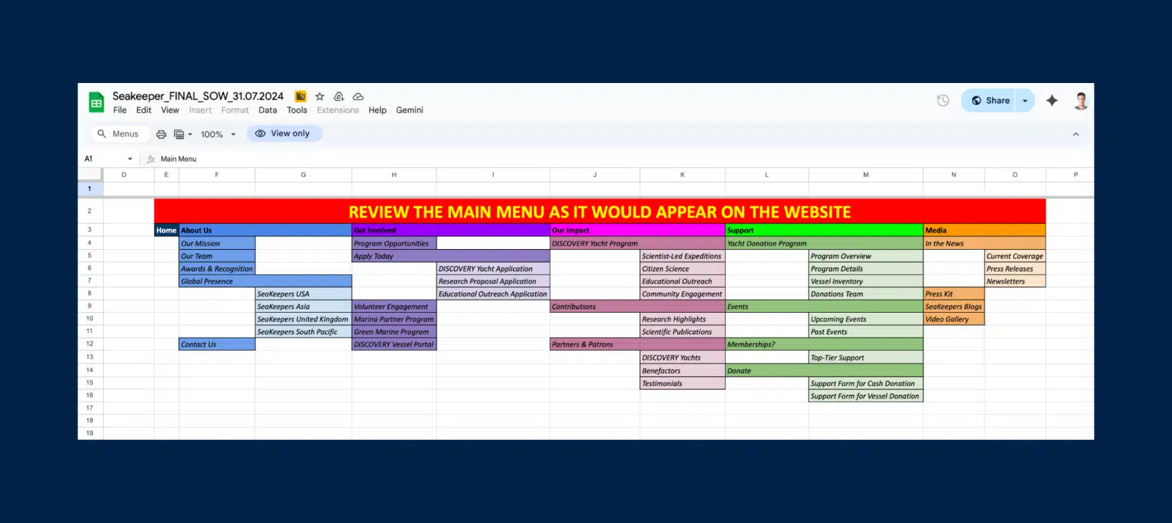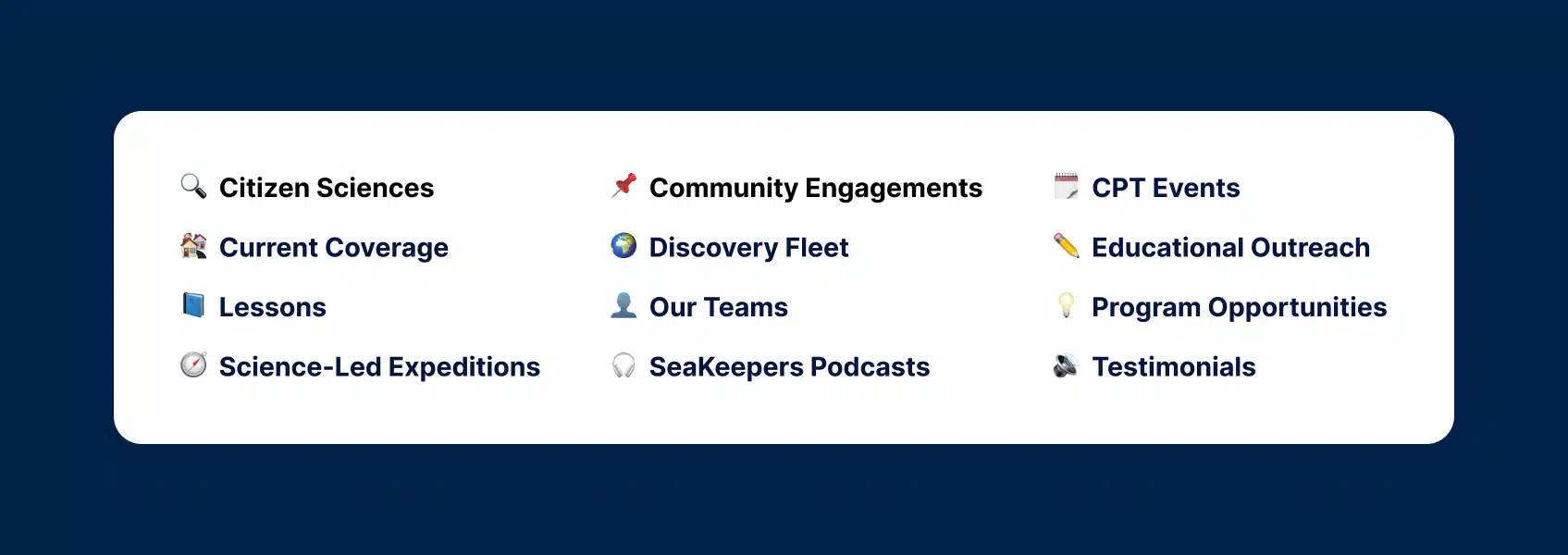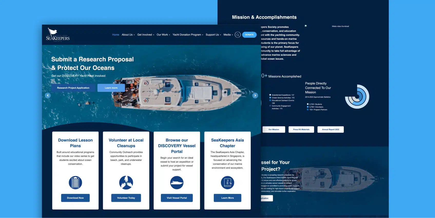 - Make SeaKeepers’ five audience pathways (vessel owners, scientists, educators, volunteers, donors) clear and intuitive.