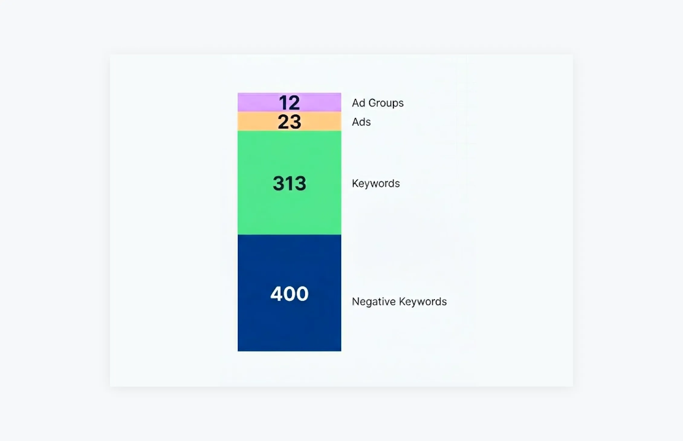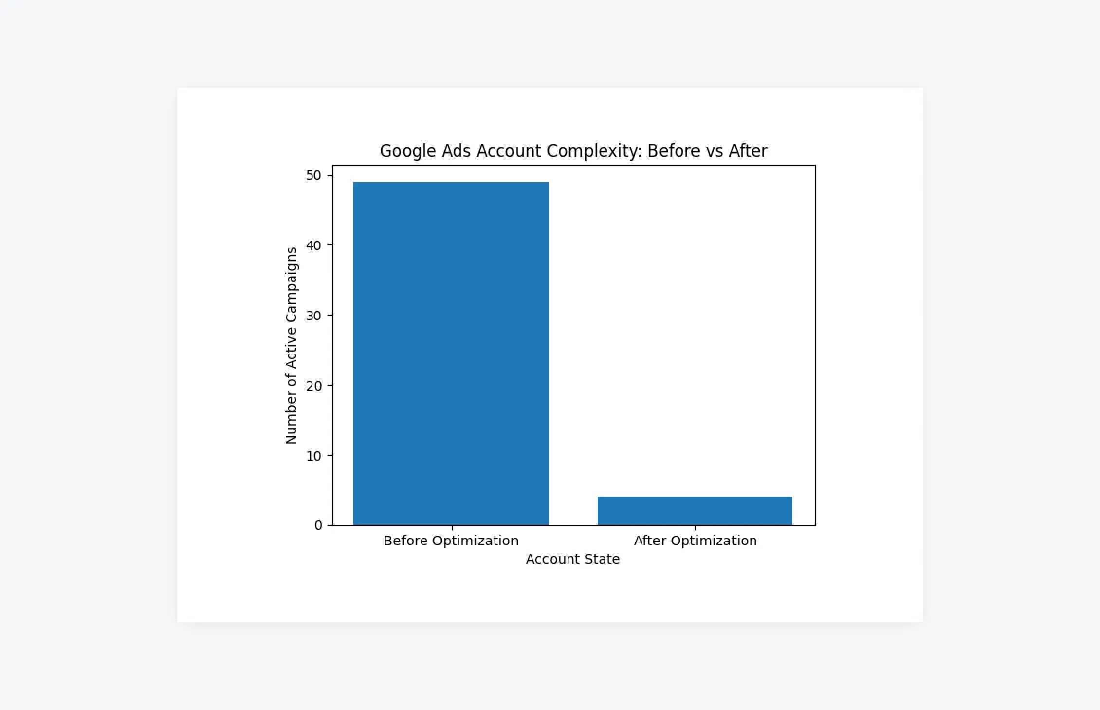 - Streamlined Structure: The account was consolidated from 49+ fragmented campaigns into a manageable, scalable core structure.